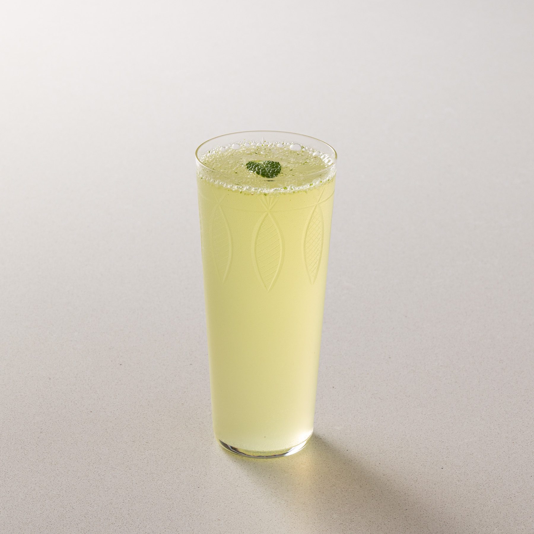 Aggiungi ora il ghiaccio a cubi, la soda fredda e miscela delicatamente. Infine, decora con un ciuffo di menta.