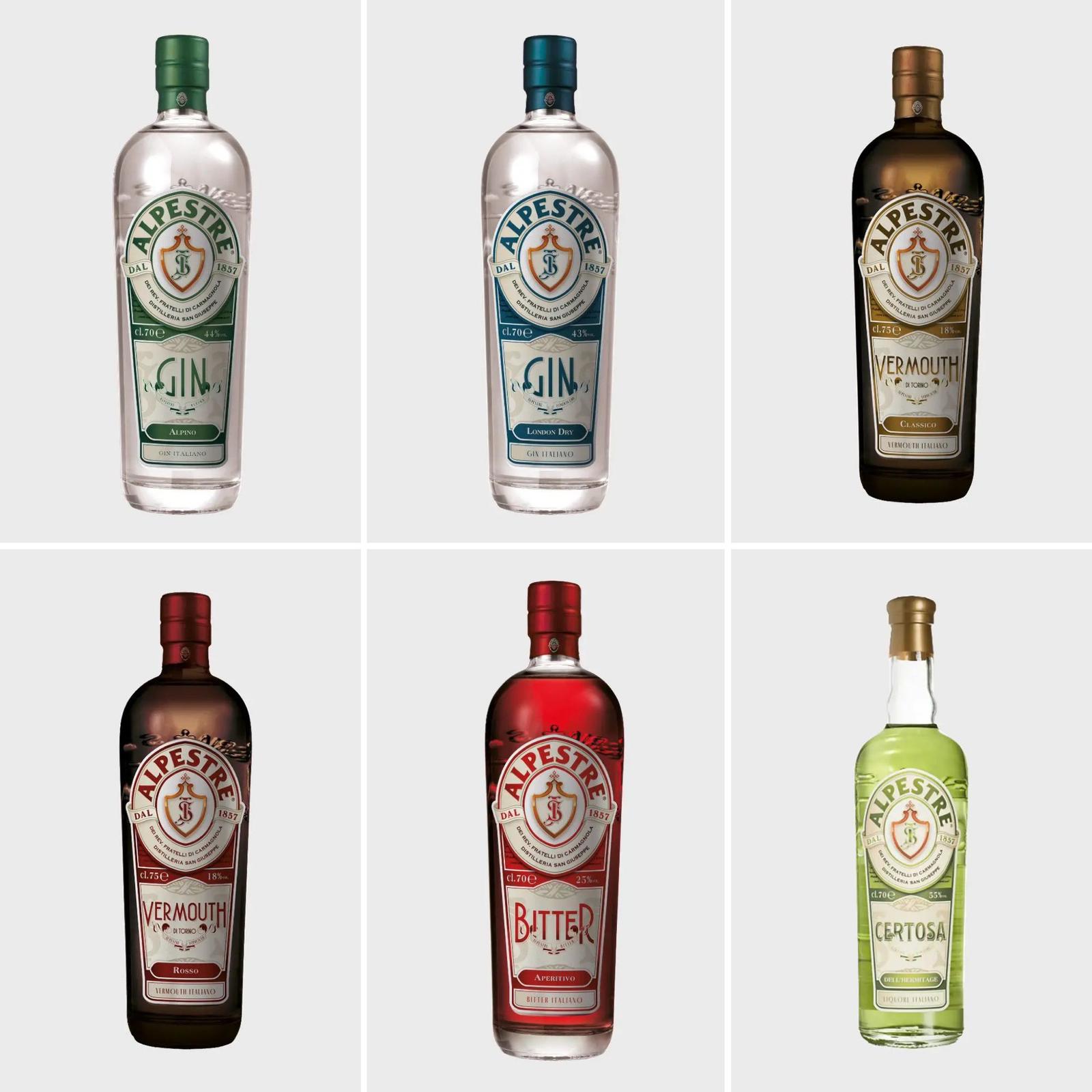 7 Signature cocktail originali con i prodotti Alpestre: London Dry gin, Gin Alpino, Bitter Rosso, Vermouth di Torino Bianco e Vermouth di Torino Rosso, Liquore di erbe verdi.